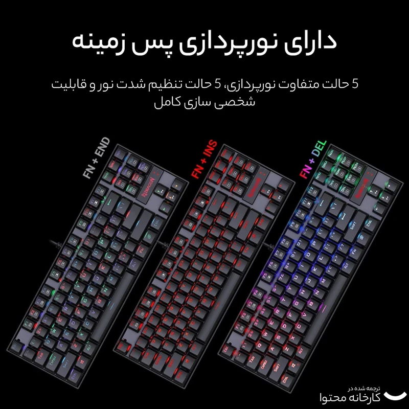 یکی از نکاتی که لوازم یک گیمر را با کاربر عادی متمایز میکند نور RGB است. حتما این نورها را در کیبورد، ماوس و هدفون دیدهاید. از نورهای RGB برای بالابردن زیبایی ظاهر لوازم به خصوص در تاریکی استفاده میشود. ردراگون برای کیبورد مخصوص بازی مدل K552 RGB قابلیت تنظیم نور 5 حالت پیش فرض را تعبیه کرده است. شما با توجه به نور سایر لوازمتان میتوانید یکی از این حالات را انتخاب کنید. شاید استفاده از نور برای ماوس و هدفون بیشتر جنبه ظاهری و نمایش داشته باشد اما در کیبورد این ویژگی مانند نور پس زمینه عمل کرده و در تاریکی و شب به آسانی قادرید از کیبوردتان استفاده کنید.