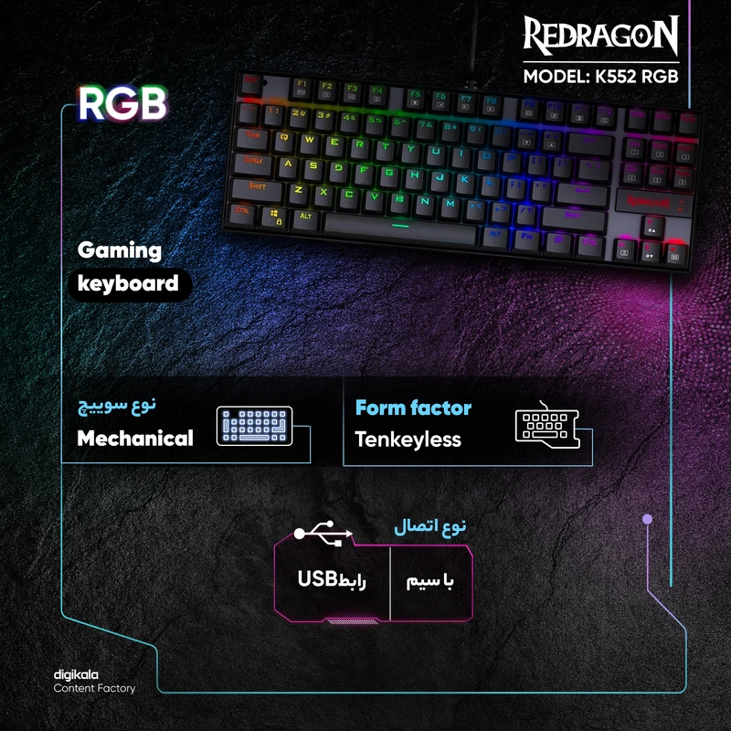 کیبورد مخصوص بازی ردراگون مدل K552 RGB برای افرادی که به دنبال کیبورد مکانیکی مخصوص بازی و در عین حال یک کیبورد جمعوجور هستند گزینه مناسبی است. این کیبورد شاید مانند سایر رقبا تعداد کلید بالایی نداشته باشد اما در عوض فضای بسیار کمی را اشغال میکندو زیبایی این کیبور در طراحی ساده و مینیمال آن نهفته است. استفاده از نورهای RGB با قابلیت تنظیم حالت و استفاده از کانکبور با روکش طلا باعث شده تا این کیبورد ارزش خرید بالایی داشته باشد. شما با استفاده از این محصول میتوانید لذت تجربه بازیتان را دوچندان کنید.
