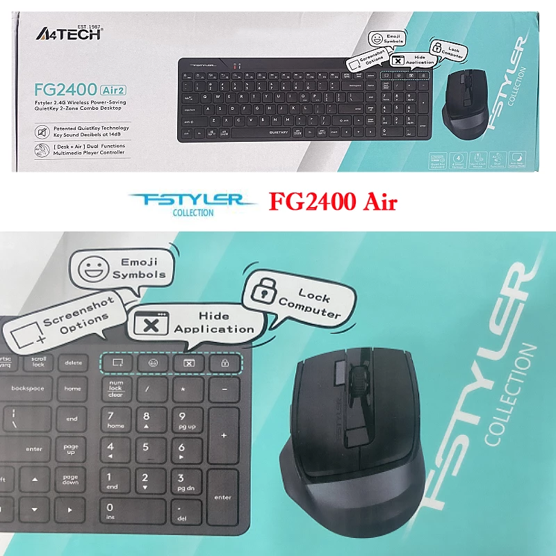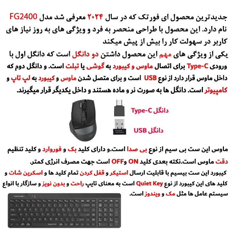 جدیدترین محصول ای فورتک با متریال و طراحی منحصر به فرد که تا امروز در هیچ یک از محصولات دیگر ندیده اید.ست ماوس و کیبورد بی سیم ای فورتک مدل FG2400 که در نوع خود بی رقیب است.ماوس این محصول دارای دو دانگل جدا گانه است که دانگل اول Type-C برای اتصال ماوس و کیبورد به گوشی یا تبلت است و دانگل دوم دانگل USB است که درون ماوس قرار دارد.(دانگل ها به صورت نر و ماده داخل یکدیگر قرار میگیرند) . کیبورد این محصول دارای کلید اسکرین شات و کلید ارسال استیکر ( ایموجی ) است. این محصول به صورت سایلنت است