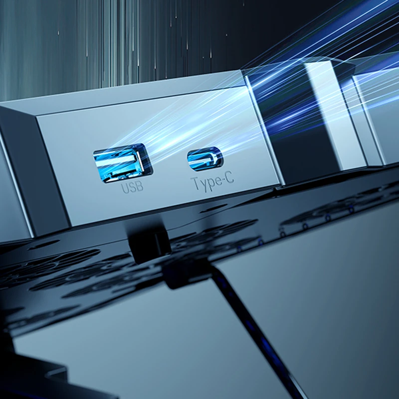یکی از برجستهترین قابلیتهای مدل GCLP 3143، بهرهمندی از ۱۵ عدد فن قدرتمند است که در قالب یک ساختار متقارن و مهندسیشده، جریان هوای گستردهای را در تمام سطح لپتاپ پخش میکنند. فنهای کول پد تسکو GCLP 3143 از سرعتی بین 1650 تا 2550 دور در دقیقه برخوردار هستند. این بازه گسترده، این امکان را به کاربر میدهد که با توجه به میزان بار حرارتی سیستم، سرعت دلخواه را انتخاب کند. در قسمت جلویی کول پد، یک نمایشگر LCD تعبیه شده است که اطلاعات مربوط به وضعیت فنها، سطح روشنایی RGB و سطح دما را در لحظه نشان میدهد. یکی دیگر از نقاط قوت GCLP 3143، وجود ۱۵ چراغ LED RGB است که همراه با فنها روشن میشوند و جلوهای فوقالعاده به میز کار یا محیط گیمینگ میبخشند. تسکو در این مدل از سیستم تأمین برق بهینهای استفاده کرده است. GCLP 3143 با ولتاژ DC 5V و توان مصرفی بین 3.75 تا 9 وات کار میکند و از طریق کابل Type-C تغذیه میشود. همچنین، وجود ۲ پورت USB این امکان را فراهم میکند تا کاربران بتوانند دستگاههای جانبی مثل ماوس، کیبورد یا هابهای دیگر را نیز به آن متصل کنند. این کول پد با ۹ سطح قابل تنظیم ارتفاع طراحی شده تا کاربران بتوانند نمایشگر لپتاپ را در زاویهای ایدهآل قرار دهند. این ویژگی، هنگام کار یا بازیهای طولانیمدت، نقش مهمی در جلوگیری از خستگی گردن و شانهها دارد. مکانیزم تنظیم ارتفاع بسیار روان و دقیق طراحی شده و در پایینترین سطح نیز کول پد کاملاً پایدار باقی میماند. در بخش جلویی کول پد، یک نمایشگر دیجیتال شفاف قرار گرفته است که اطلاعات کلیدی مثل سرعت فن، وضعیت نورپردازی و سطح تنظیم ارتفاع را نمایش میدهد. در کنار خود کول پد، داخل بستهبندی محصول یک پایه نگهدارنده موبایل قرار دارد که بهراحتی در قسمت کناری کول پد متصل میشود. همچنین، یک کابل Type-C با روکش کتان برای انتقال برق و اتصال به منبع تغذیه، و یک آداپتور EU با ولتاژ 12 ولت نیز همراه محصول ارائه شده است.