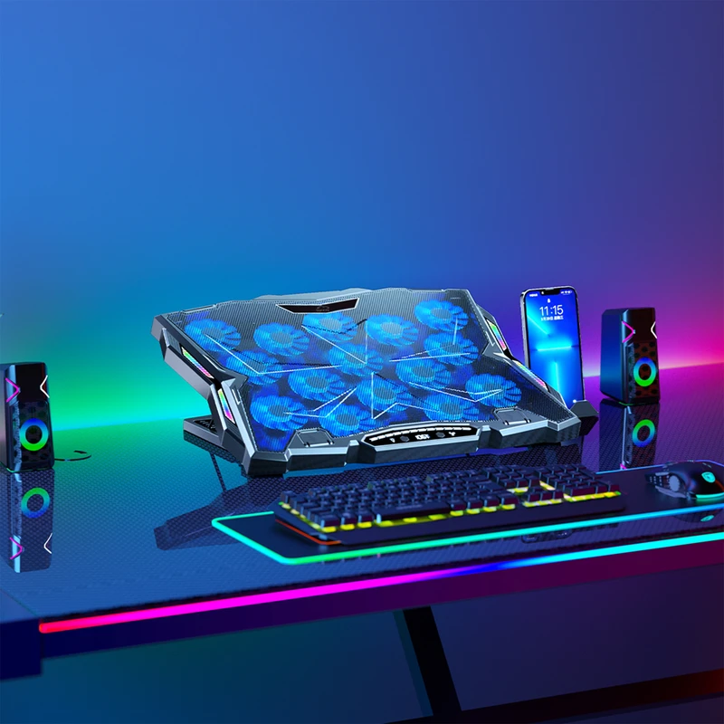 | قابلیتهای استند و پایه خنککننده | کلید روشن/خاموش قابلیت تنظیم ارتفاع خروجی USB نورپردازی LED تک رنگ |